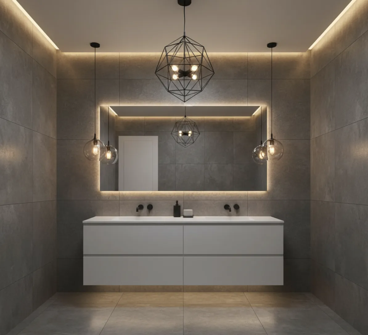 Lokalizacja lampy wiszącej musi być dokładnie przemyślana. Najbezpieczniejsze i najpopularniejsze miejsca to symetryczne zawieszenie dwóch lamp po bokach lustra lub centralne umieszczenie jednej lampy. W obu przypadkach lampa działa jako biżuteria wnętrza, przyciągając wzrok i stanowiąc kontrapunkt dla minimalistycznej armatury i ceramiki. Jej światło jest zazwyczaj ciepłe (K – K), ponieważ ma za zadanie budować nastrój relaksu, a nie służyć precyzji.